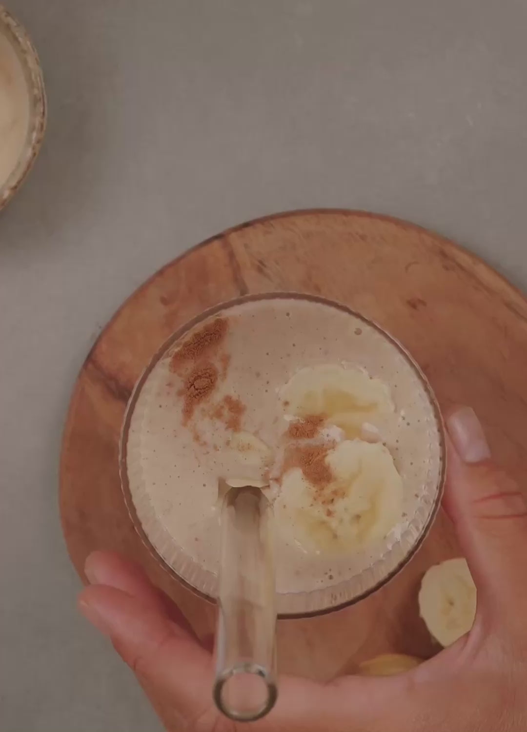 - Add all ingredients to a blender and blend on high for 1 minute until thick and creamy. Pour into a glass and finish with a sprinkle of cinnamon and flaked almonds.